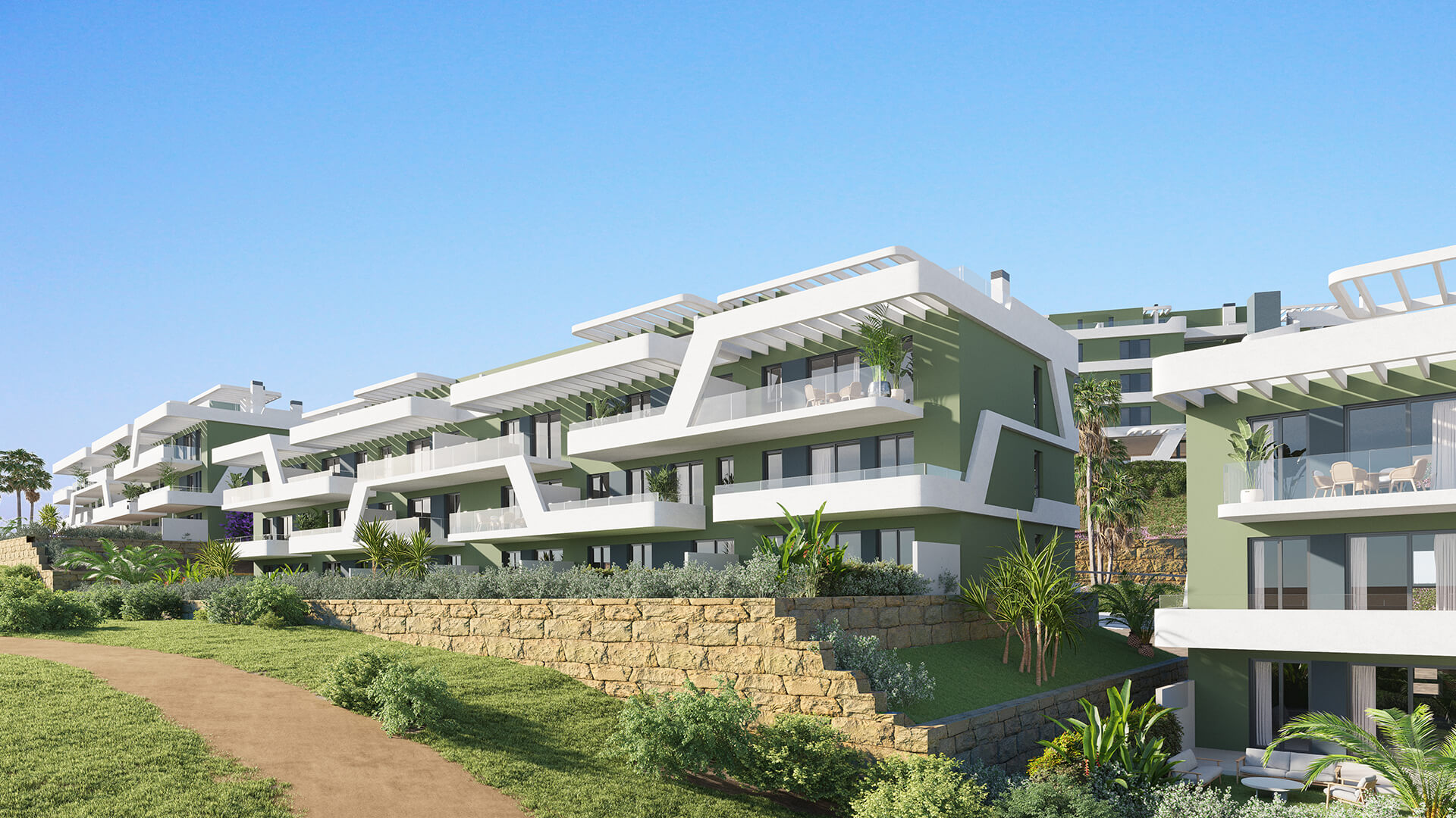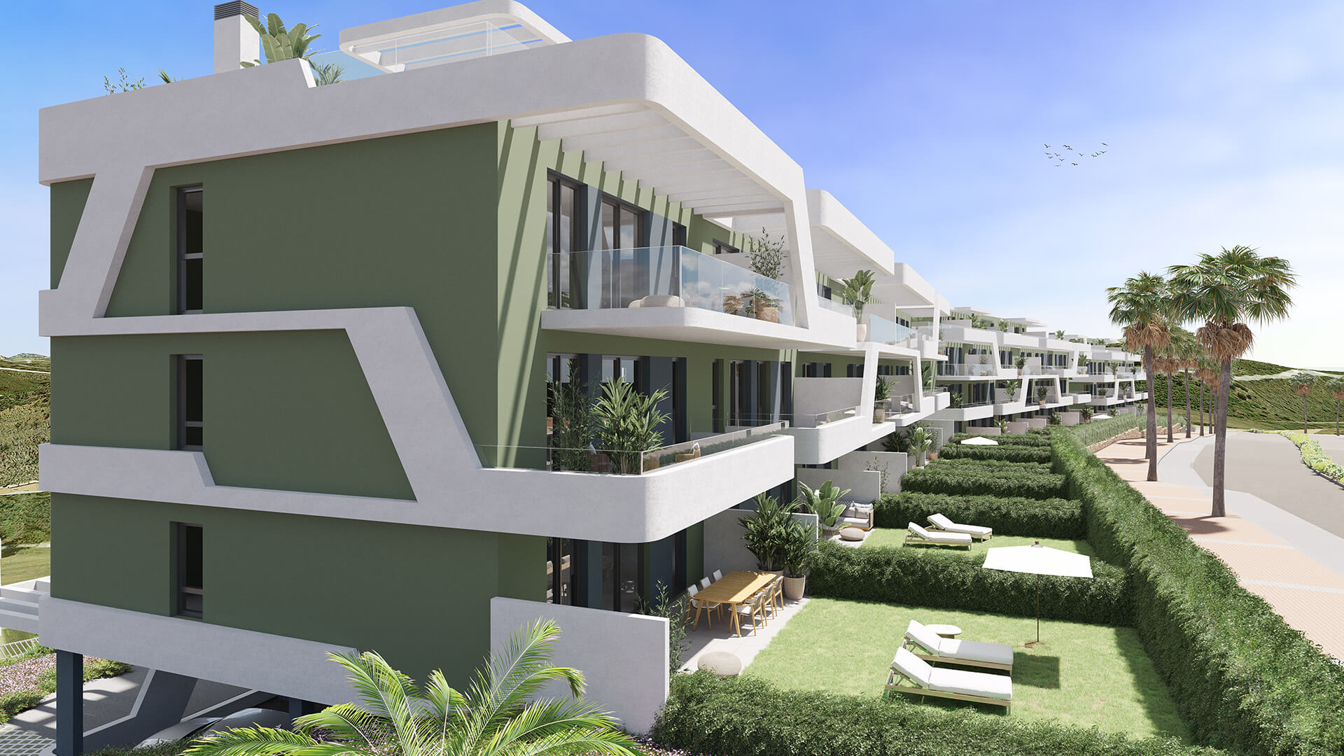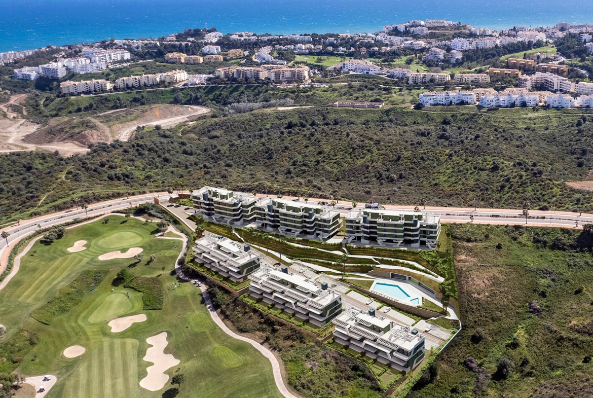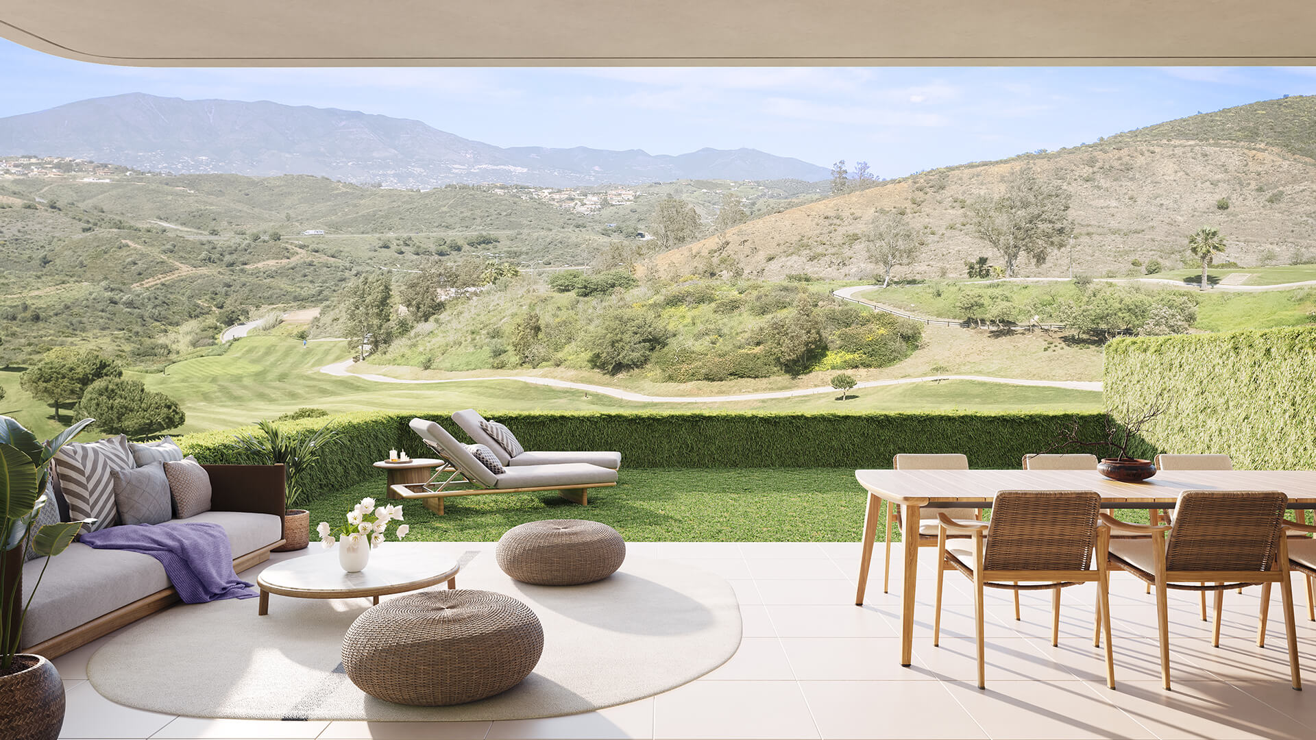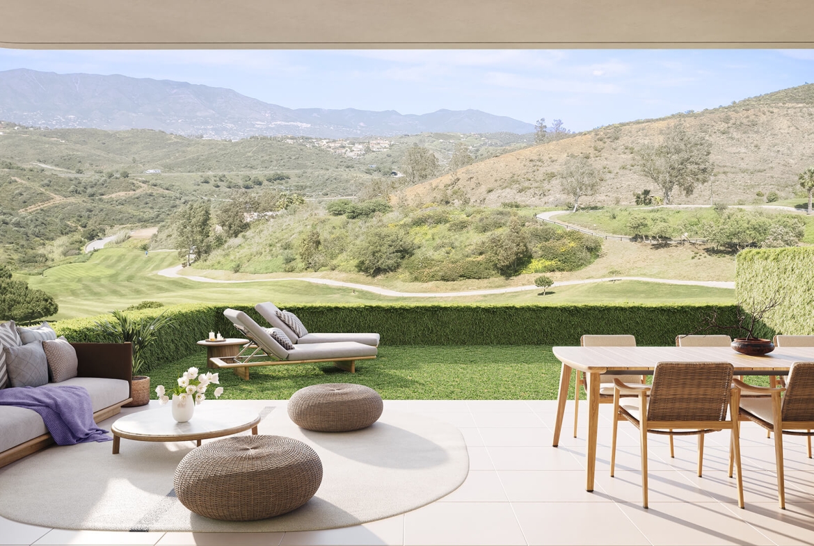 Large terrace (or garden for ground-floor units) with panoramic sea & golf views