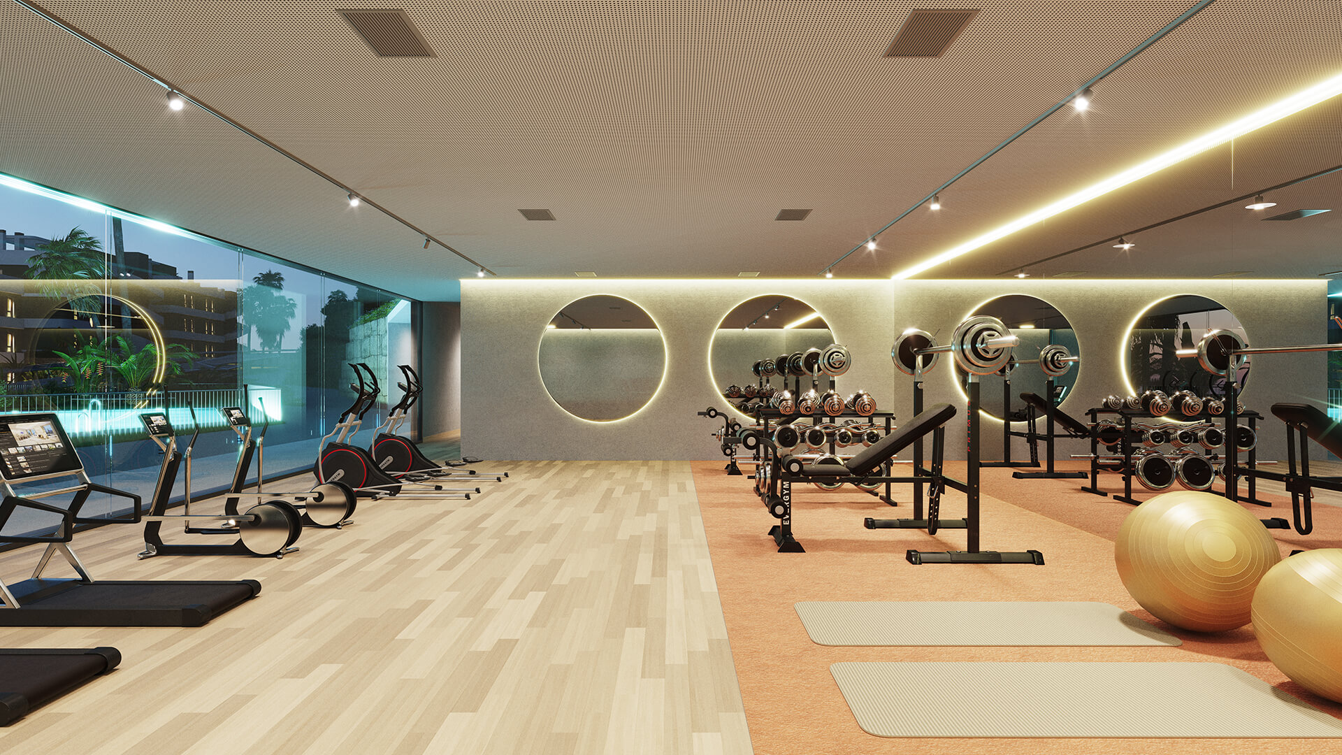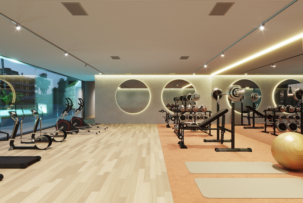 Resort-style community amenities: communal swimming pool, fully equipped gym, business centre overlooking communal gardens