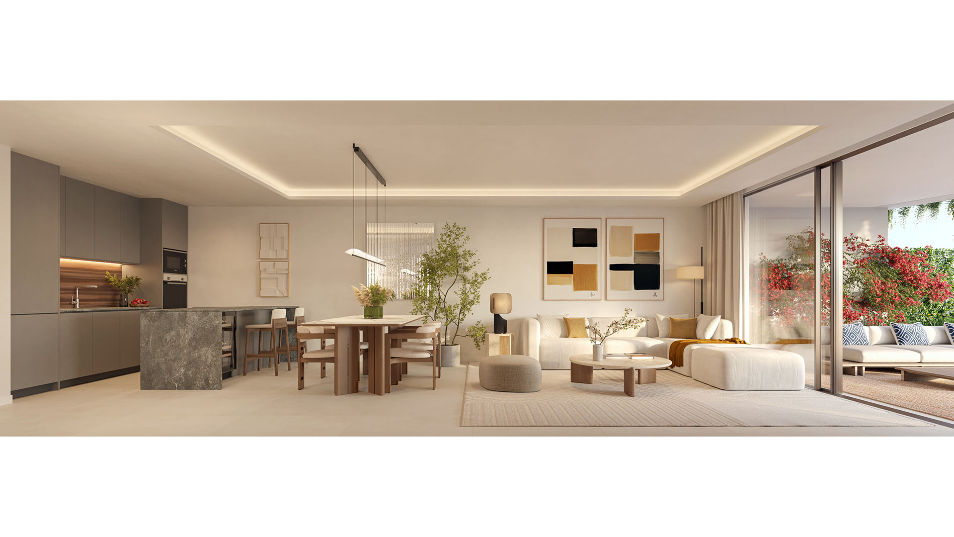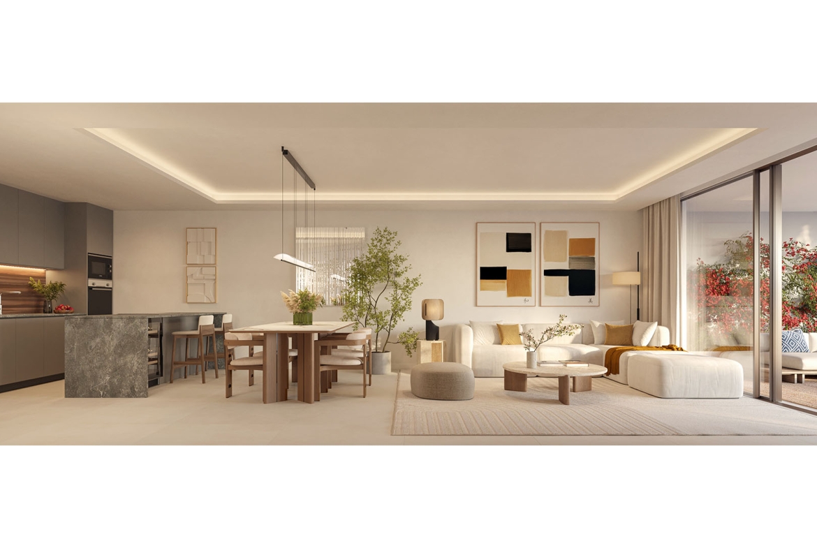 With its south-facing orientation and open sea views, the apartment is bathed in natural light throughout the day. The open-plan living and dining area flows seamlessly onto a generous terrace, ideal for morning sun and al-fresco evenings. The master suite features an en-suite bathroom and fitted wardrobes; the two additional bedrooms are spacious and share a second modern bathroom.