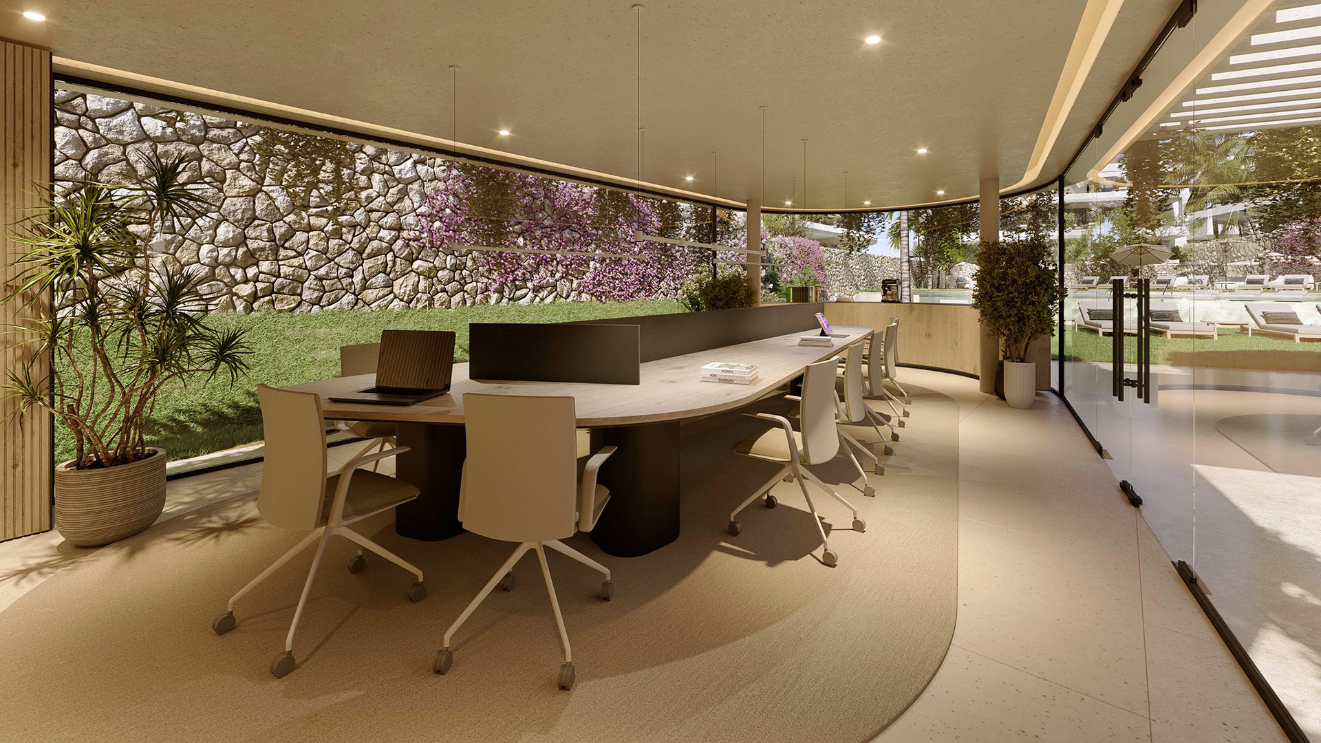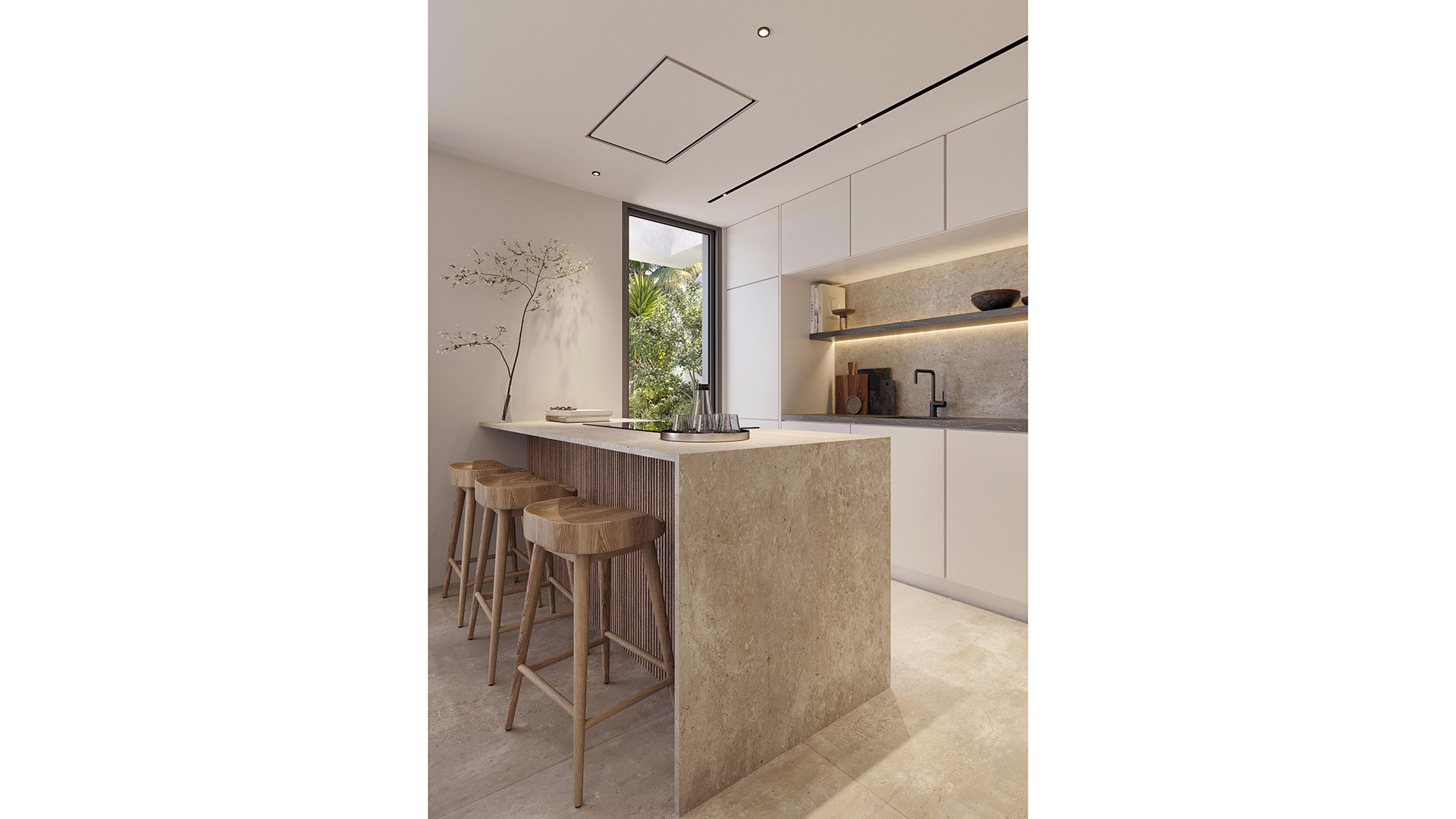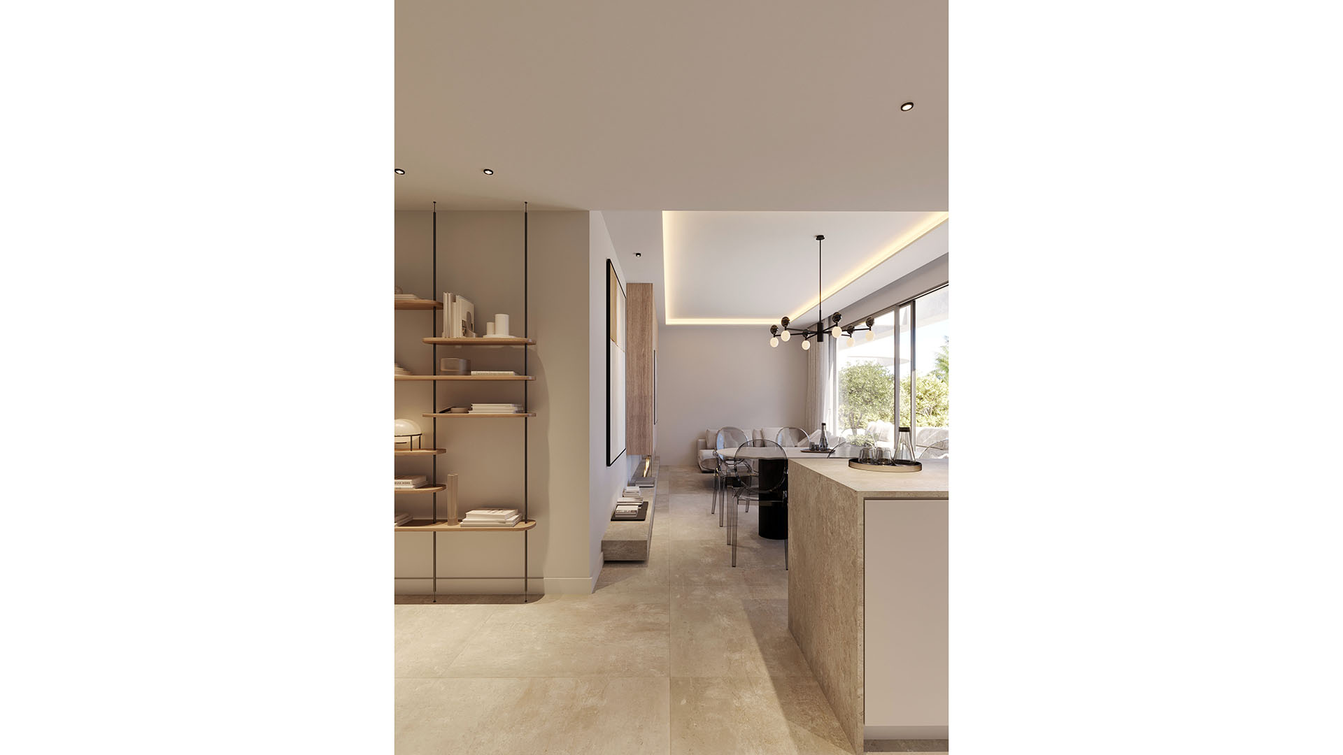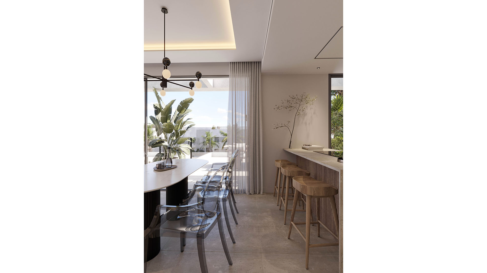 From the moment you enter, you’re greeted by a bright, open-plan living area with floor-to-ceiling glass doors, which blur the lines between inside and out. The interior decor features a neutral palette complemented by natural materials such as wood and stone, fostering a calm and inviting atmosphere.