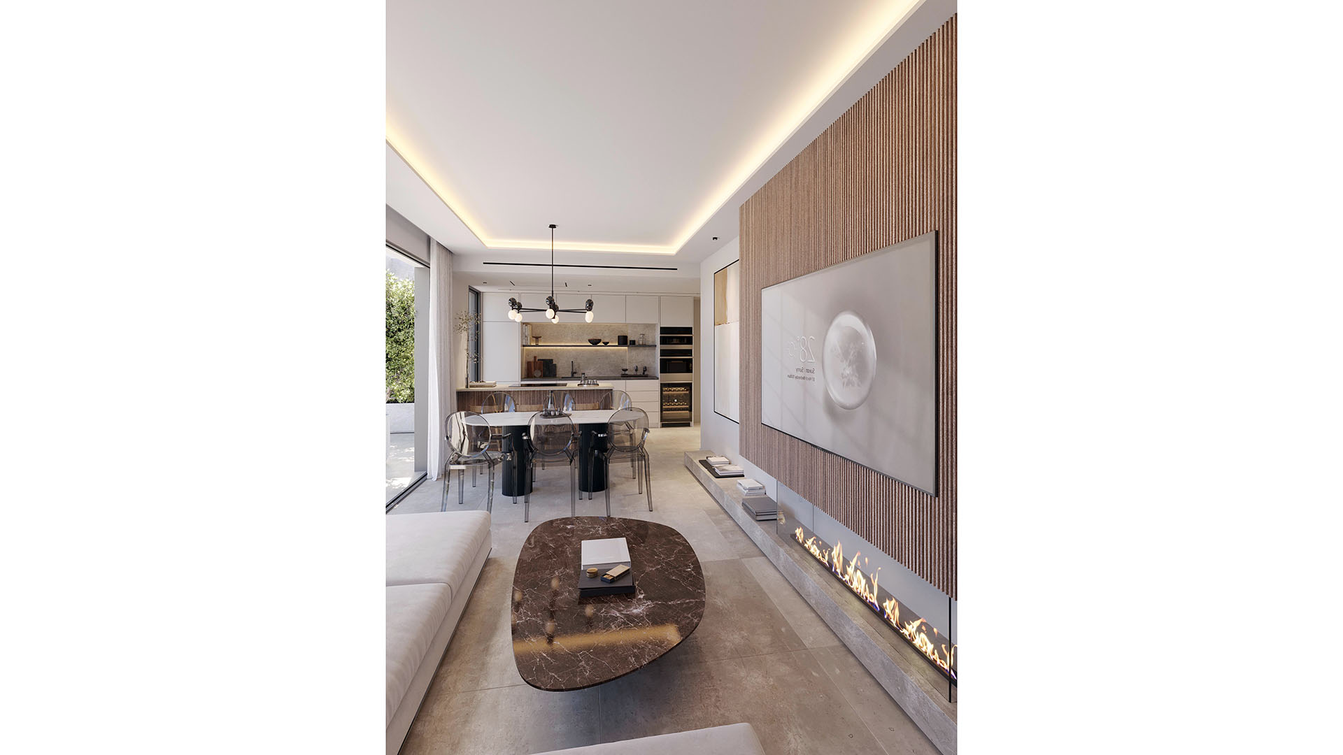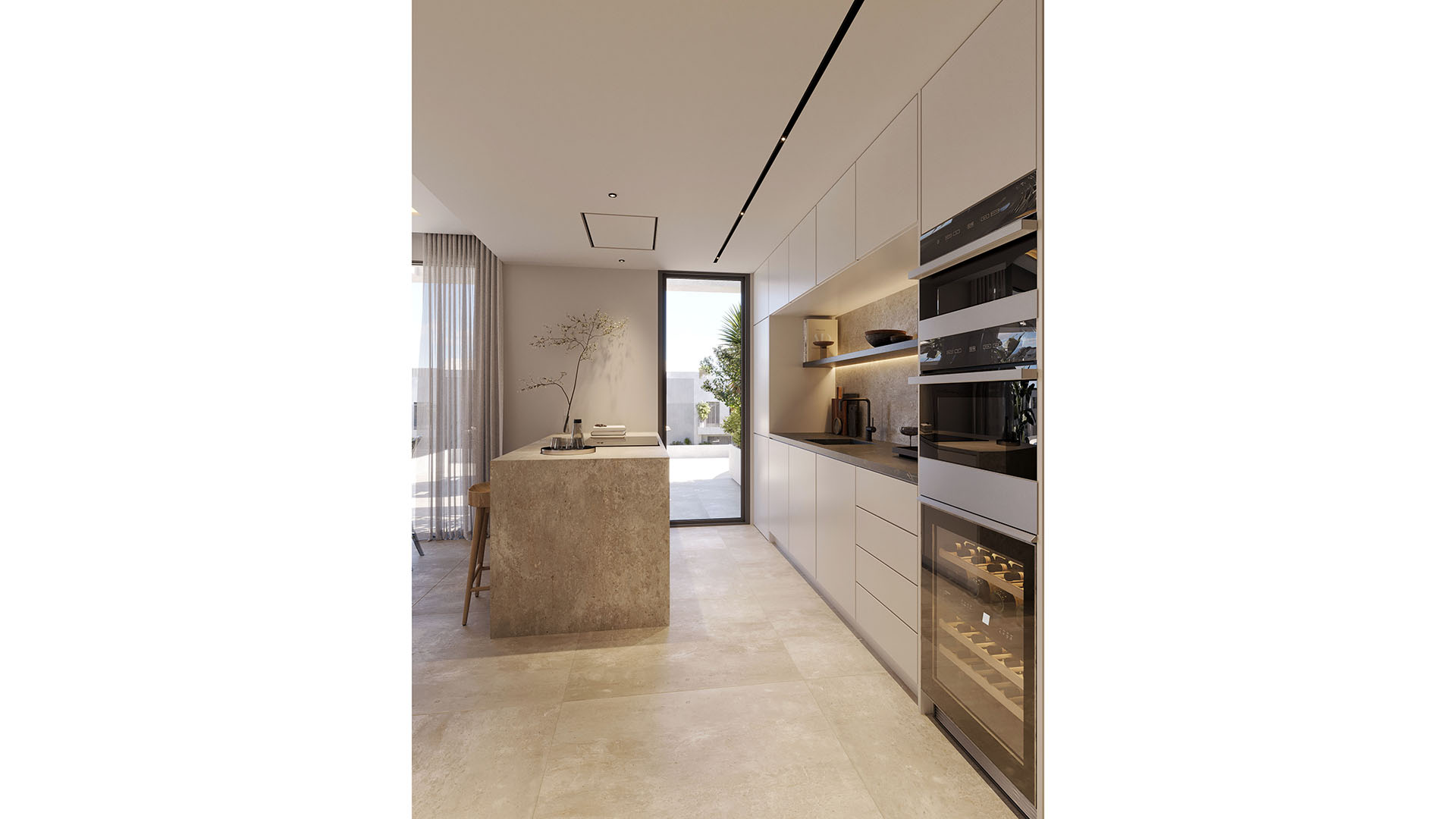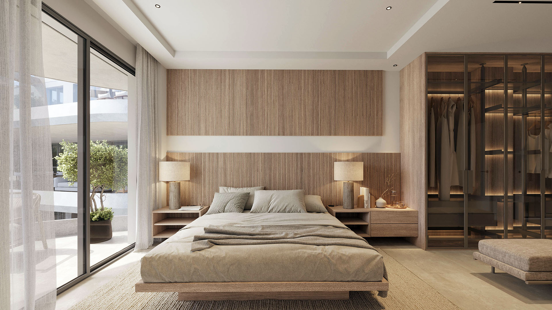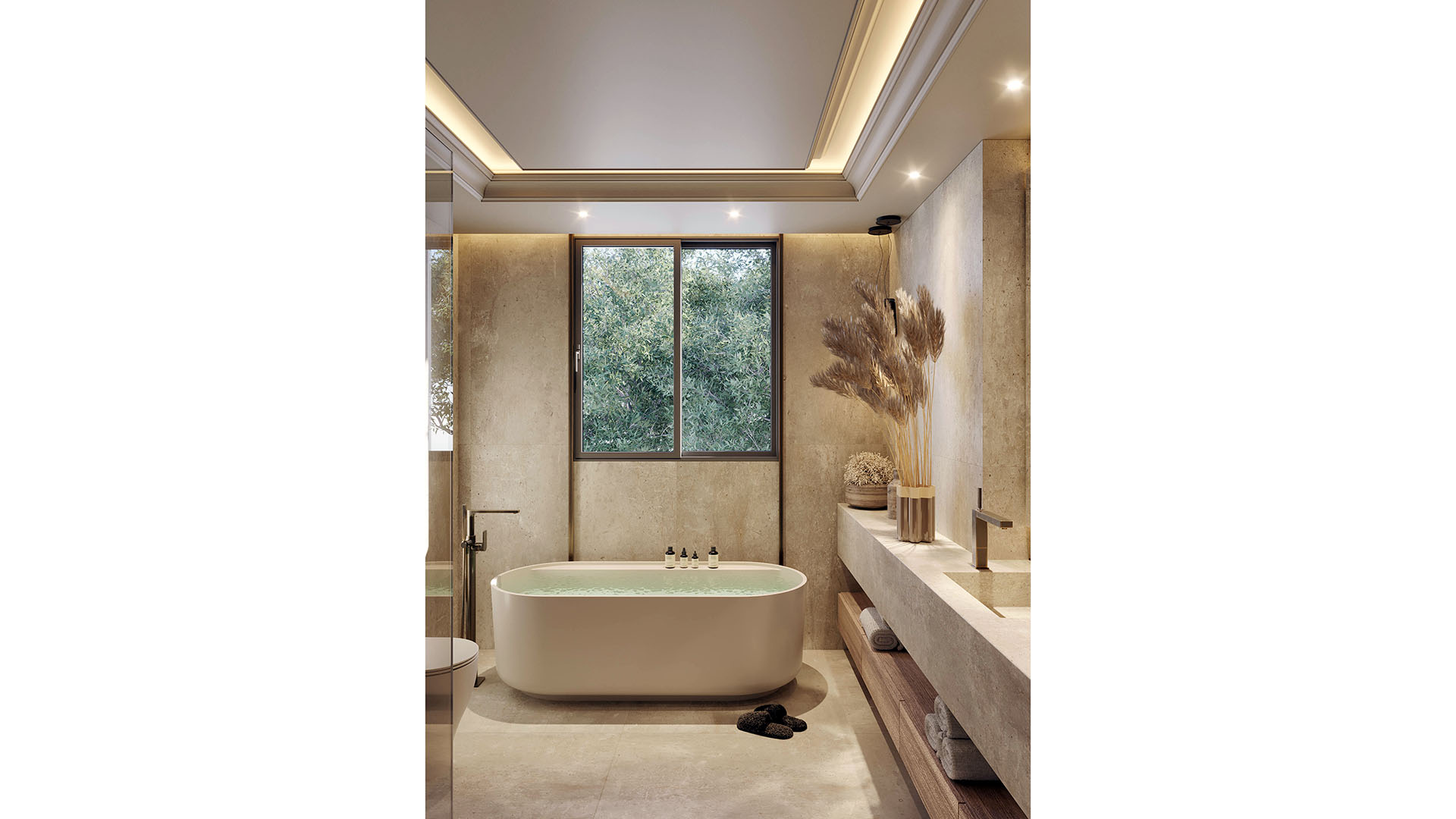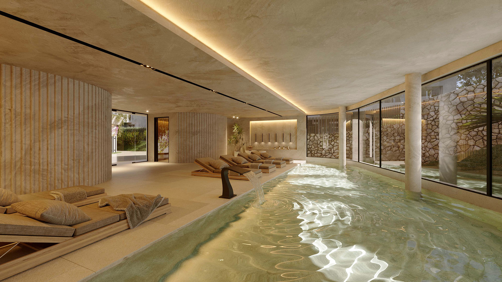From the moment you enter, you’re greeted by a bright, open-plan living area with floor-to-ceiling glass doors, which blur the lines between inside and out. The interior decor features a neutral palette complemented by natural materials such as wood and stone, fostering a calm and inviting atmosphere.