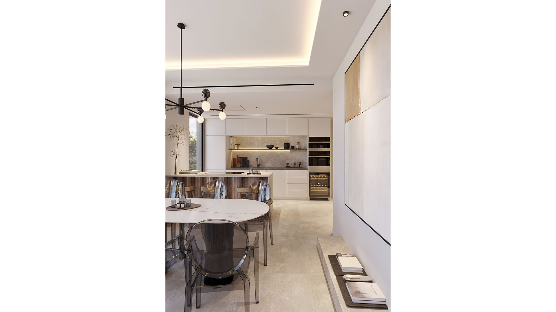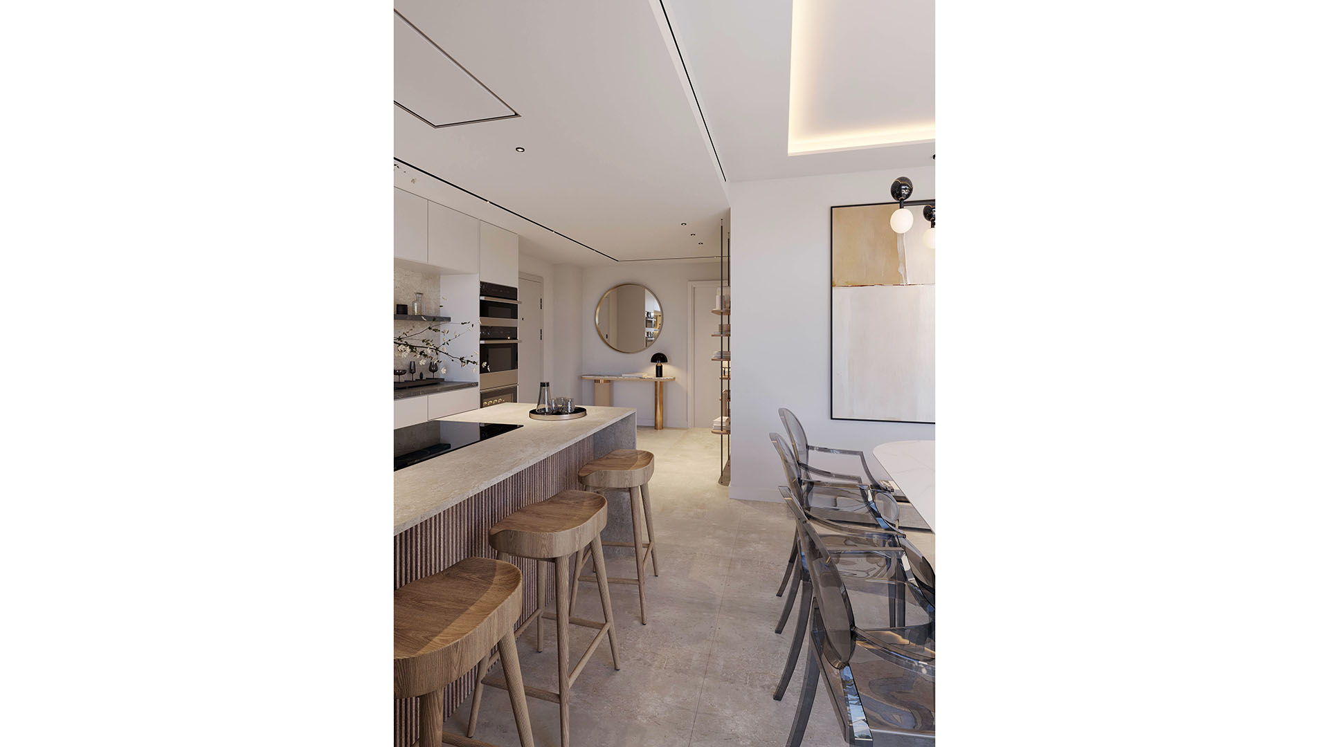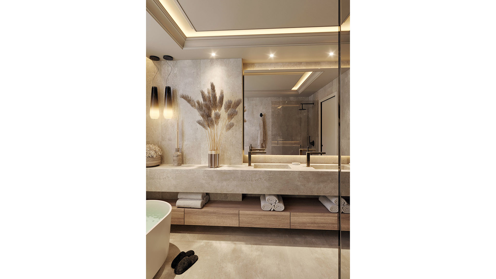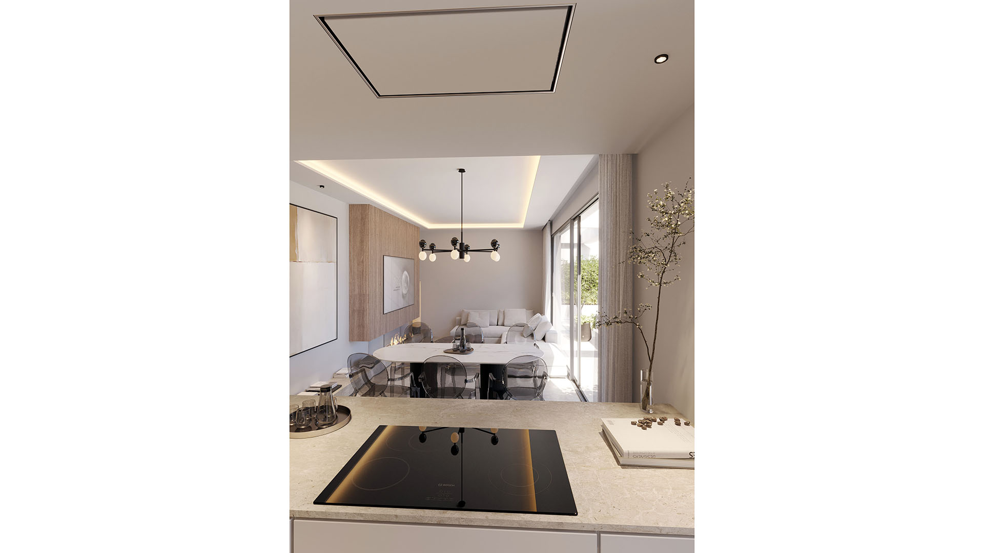 From the moment you enter, you’re greeted by a bright, open-plan living area with floor-to-ceiling glass doors, which blur the lines between inside and out. The interior decor features a neutral palette complemented by natural materials such as wood and stone, fostering a calm and inviting atmosphere.